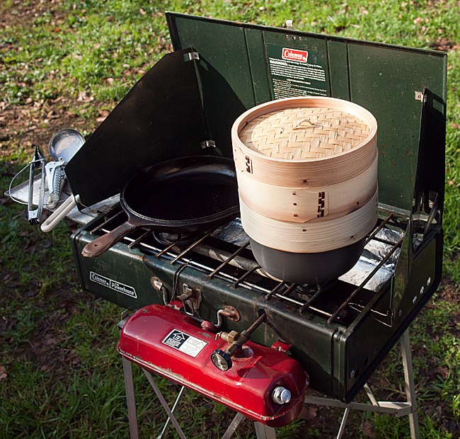 PRIMUSのライテッククッカーで蒸篭を蒸します。