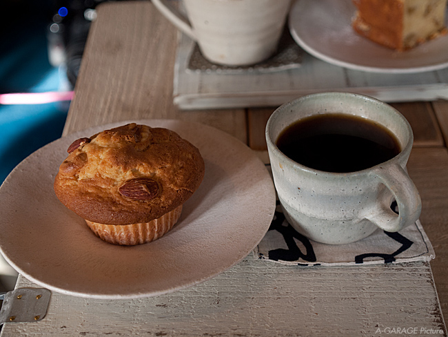 珈琲とアーモンドマフィンのセット。笠間市は陶芸が盛んな地域でここのオーナーさんも陶芸家らしいです。