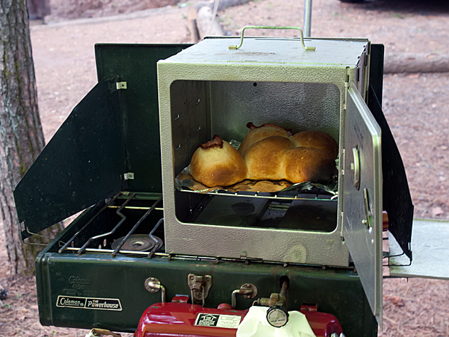 発売当時に購入したコールマンの初期型オーブン。(パンの2次発酵中)