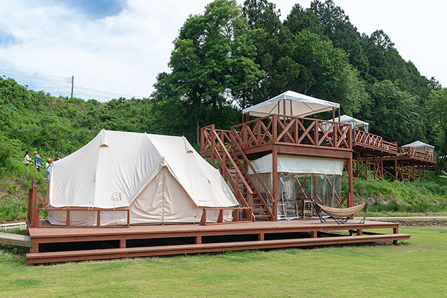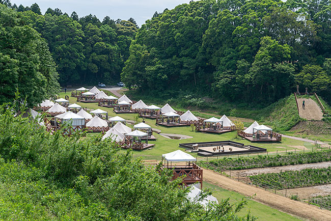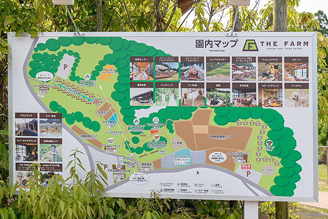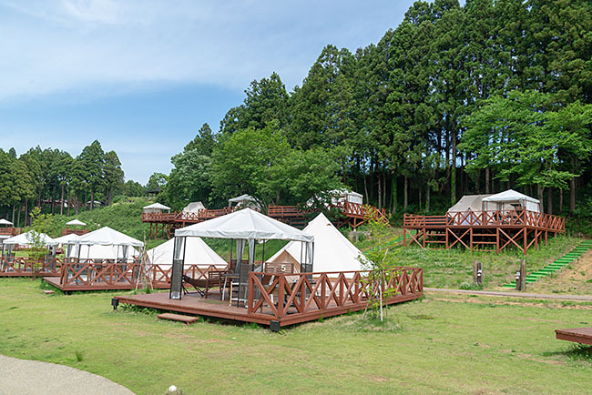 広大な敷地の中にグランピングやコテージ、オートキャンプ、貸農園や収穫体験エリア、ジップスライダー、カフェ、日帰り温泉が点在するリゾート施設です。
