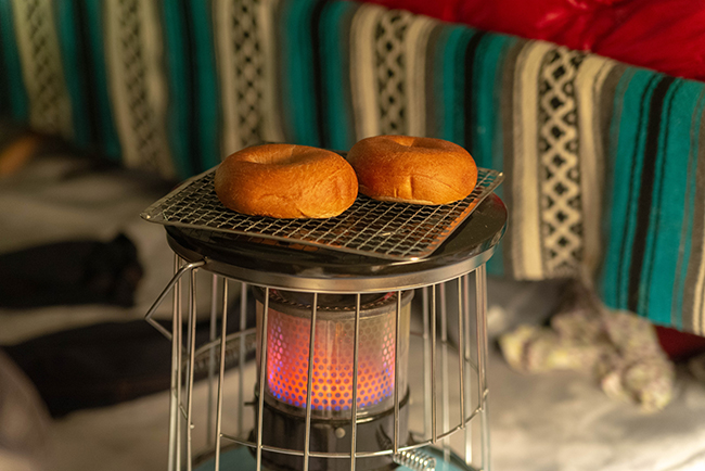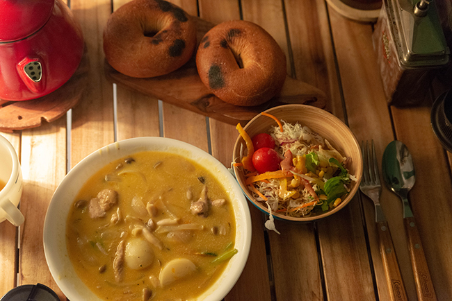ストーブでベーグルを焼いてサラダと豆乳シチューのシンプルな夕食です。