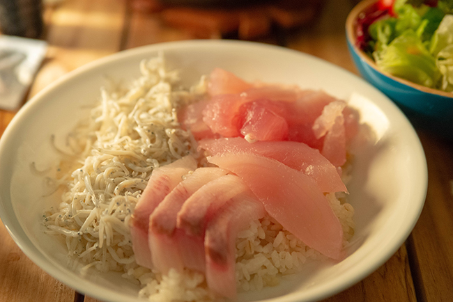 静岡おでんと釜揚げしらす、カンパチ、マグロ丼の夕食
