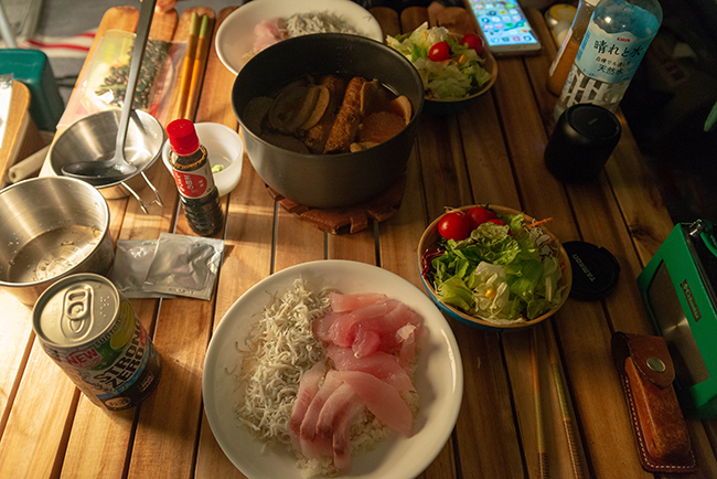 2泊キャンプの2日目は地元産の食材を使いたいですね。今回は高速のSAで購入した静岡おでんに地元スーパーで購入した10枚で108円の黒はんぺんを足したおでんにご飯を炊いて釜揚げしらすと焼津で捕れたカンパチとマグロの刺身を載せた海鮮丼にしました。