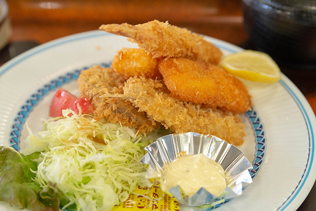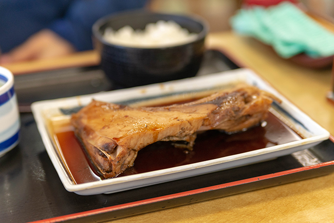 昼食はさかなセンターの大食堂で、まぐろカマの煮付け定食、魚介のミックスフライ定食に単品で黒はんぺんのフライをオーダーしました。初日の昼に海鮮丼を食べてるので温かいおさかな定食にしました。因みにカニ入りの味噌汁が飲み放題でした。