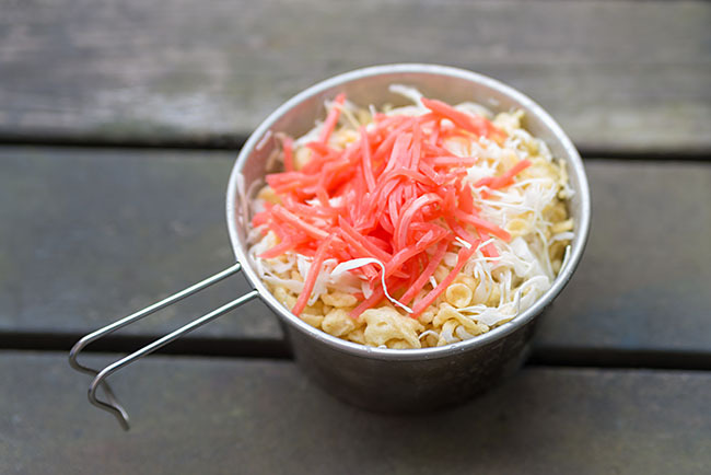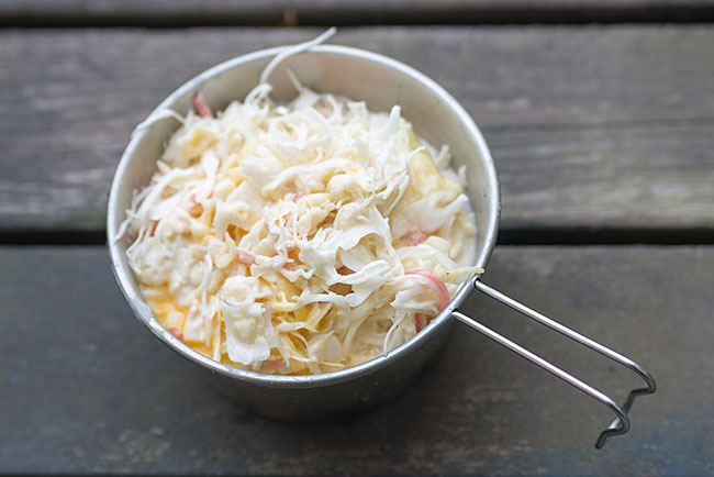 シェラカップに材料を全部入れちゃいます。キャベツも全部いきましょう!