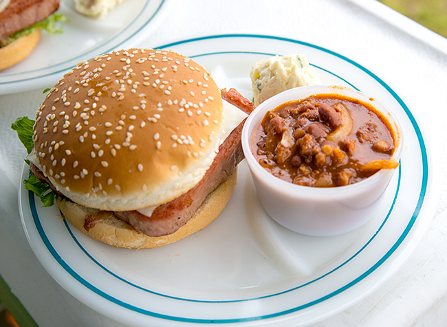 スパムにレタス、スライスチーズ、オニオンスライスを挟んだスパムバーガー