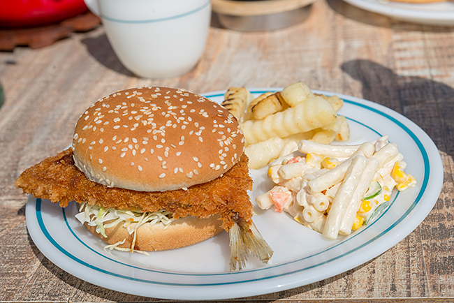最近のキャンプで作ったアジフライバーガー。スーパーの惣菜のアジフライとキャベツの千切りにソースだけで味付けしたシンプルなフィッシュバーガーです。魚介系バーガーにも相性の良いバンズです。