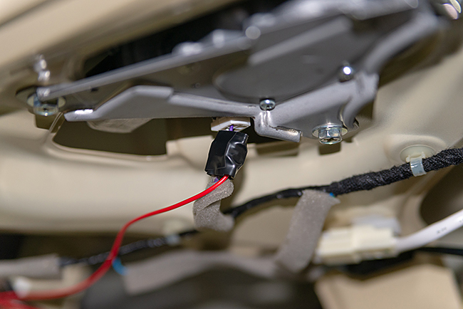 リアワイパーのコネクターにある紫色の配線がイグニションで12Vが給電するんです。ここで注意したいのはアクセサリ電源ではないということ。
