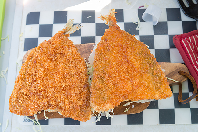 当然ながらバンズよりはみ出ます。アジフライの他には千切りキャベツのみで味付けは中濃ソースだけです。