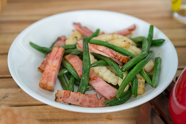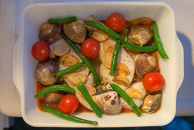 今回は春キャベツとインゲンにプチトマト、ハマグリと鱈のアクアパッツァにしました。