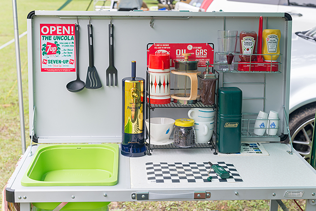 緑のColemanのシングルバーナーと赤の琺瑯は雰囲気ありますねw。