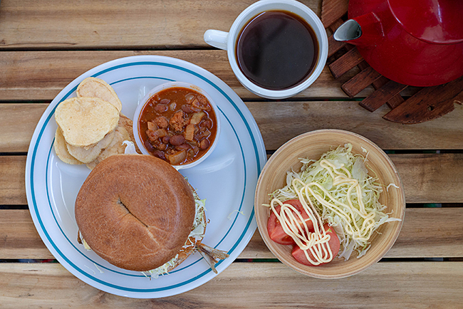 ランチはいつも買物をする尾張屋さん謹製のアジフライをベーグルで挟んだサンドイッチにホーメルのチリビーンズ缶を温めて付け合せにポテトチップとキャベツサラダ。