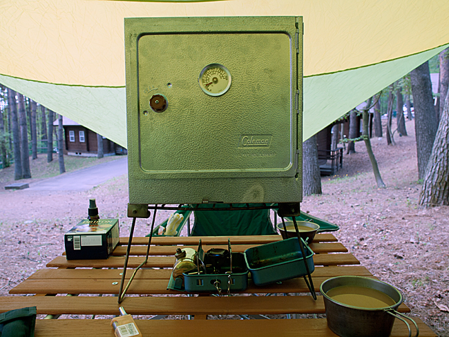 発売当時に購入したコールマンの初期型オーブン。(パンの2次発酵中)